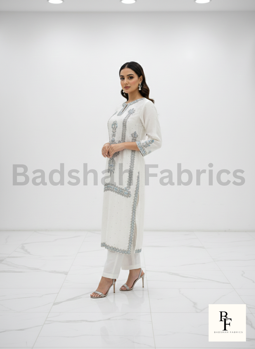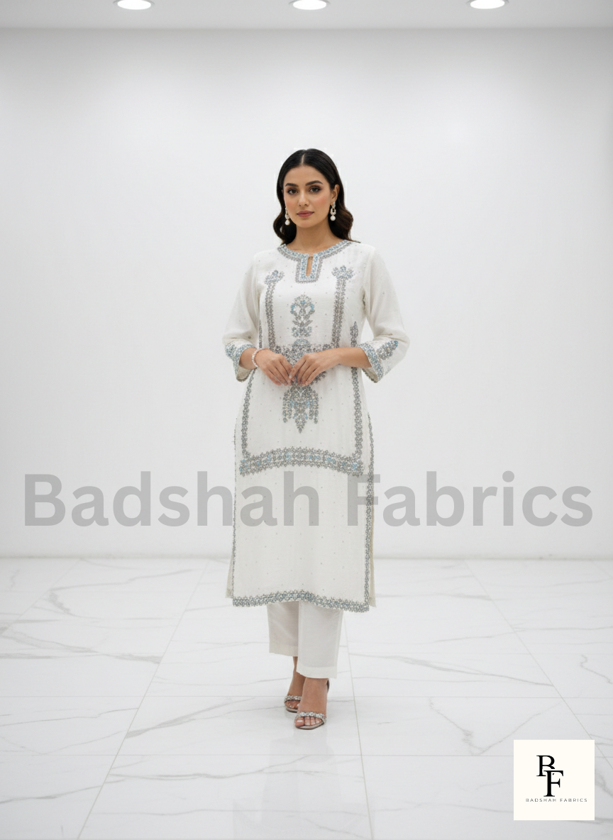 Introducing a refined and sophisticated ensemble from Badshah Fabrics, crafted for women who appreciate subtle luxury and timeless handcrafted artistry.