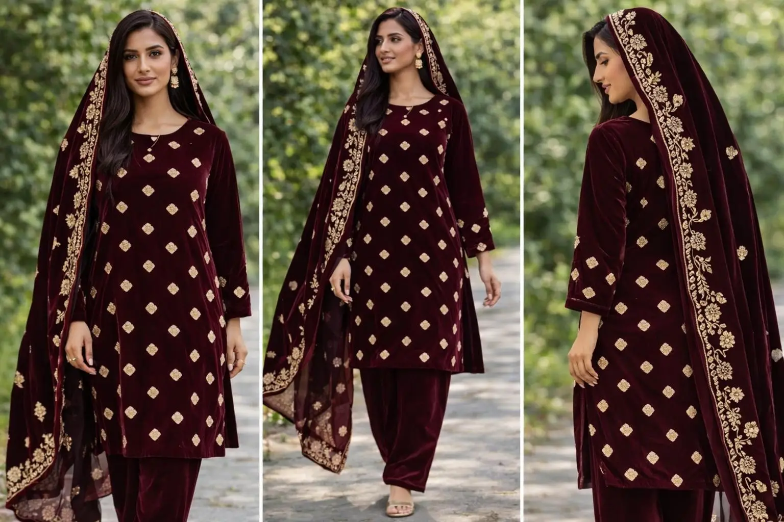 Step into timeless sophistication with this luxurious 3-piece velvet suit. Crafted from premium velvet fabric, the ensemble showcases intricate gold zari embroidery in classic paisley and floral motifs, creating a rich and regal appeal perfect for festive gatherings, weddings, and formal evenings.