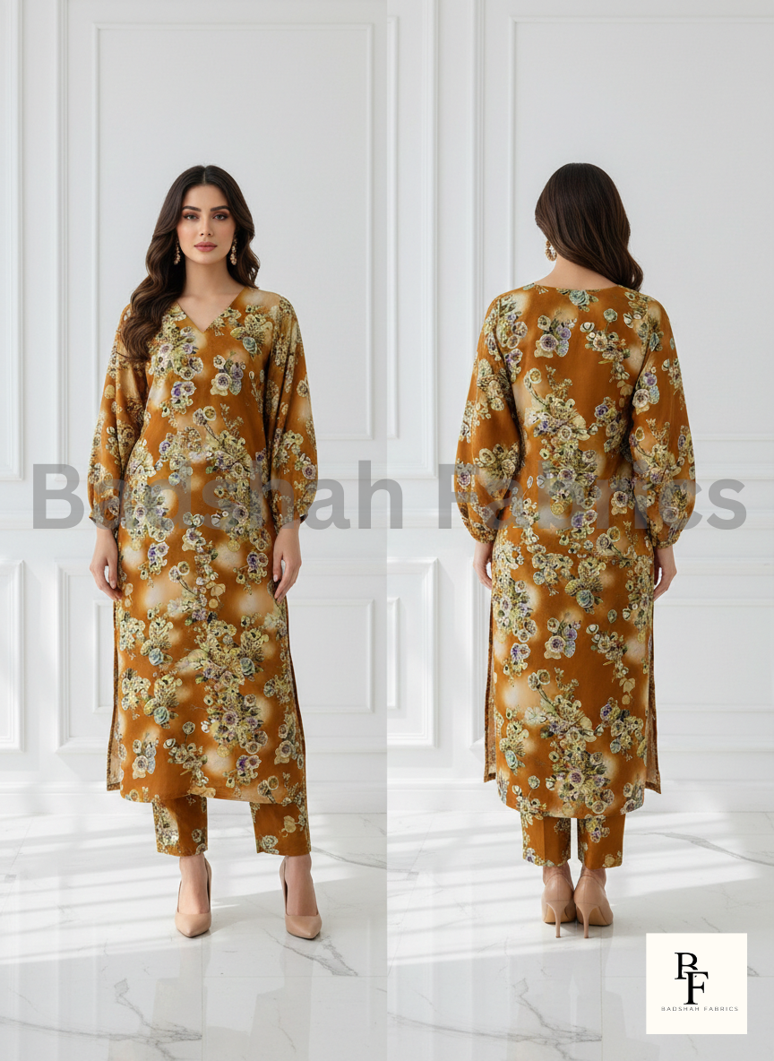 This elegant Korean Fabric Paradise Silk 5D Print 2 Piece Suit is designed to bring timeless charm and modern style together. The suit features a luxurious mustard color base, beautifully highlighted with fine floral 5D digital prints in soft ivory, blush, and subtle earthy shades, creating a warm and graceful visual appeal.